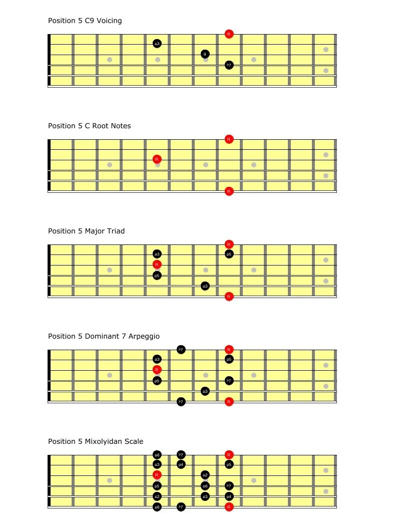 Lastly if we examine the Mixolydian Scale from position 5 we can see that we’re using the highest available 9th/2nd from that position.