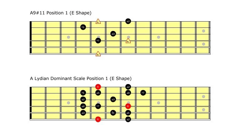 It’s a beginner system - this is based off the presumption that all the system is used for is moving open chords up and down the neck. This is just one small aspect of the CAGED system. You can express anything through the CAGED system. Below is a position 1 (E Shape) A9#11 chord voicing which comes from the Lydian Dominant Scale.